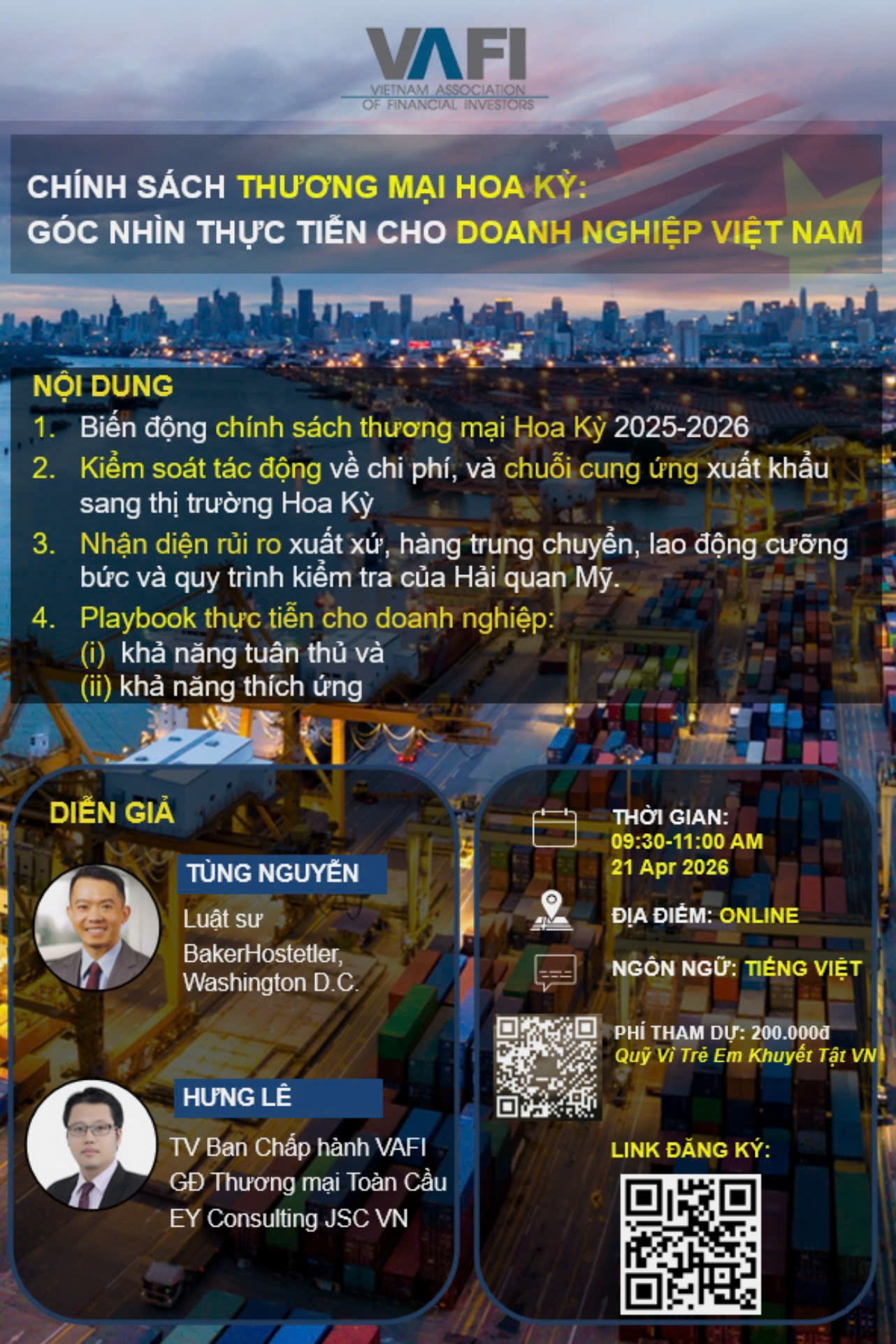 Nhằm hỗ trợ Quý doanh nghiệp cập nhật kịp thời các diễn biến mới nhất, đồng thời nhìn nhận toàn diện cả cơ hội và rủi ro phát sinh từ các công cụ chính sách mới của Hoa Kỳ, Hiệp hội các nhà đầu tư tài chính Việt Nam (VAFI) sẽ tổ chức buổi hội thảo Online về: Chính sách thương mại và thuế quan Hoa Kỳ